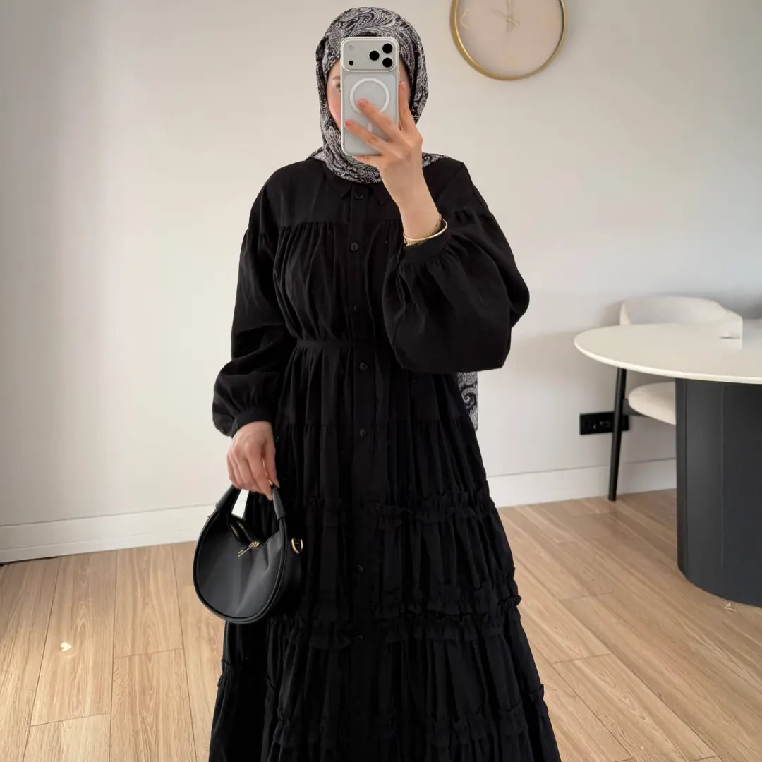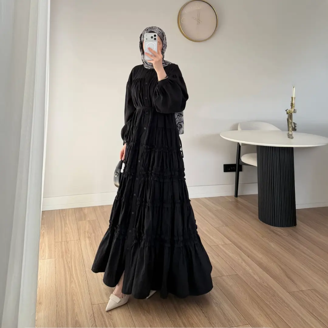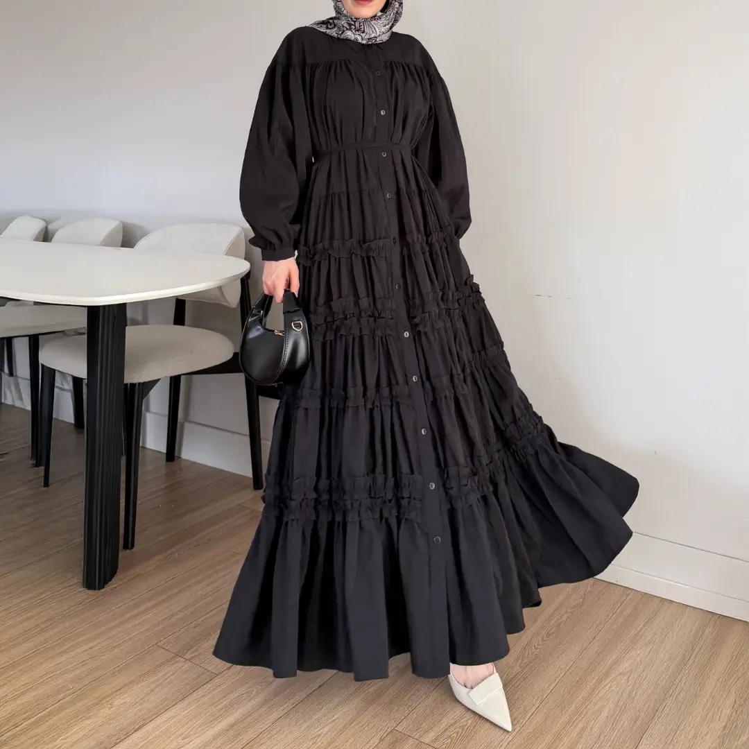 Kat kat detayları sayesinde hareketli ve dikkat çekici bir görünüm sunan bu uzun elbise, rahat kalıbıyla gün boyu konfor sağlar. Büzgülü yapısı ise bedene hoş bir form kazandırarak stilinizi daha etkileyici hale getirir. Hem topuklu ayakkabılarla hem de sandaletlerle kolayca kombinlenebilir.