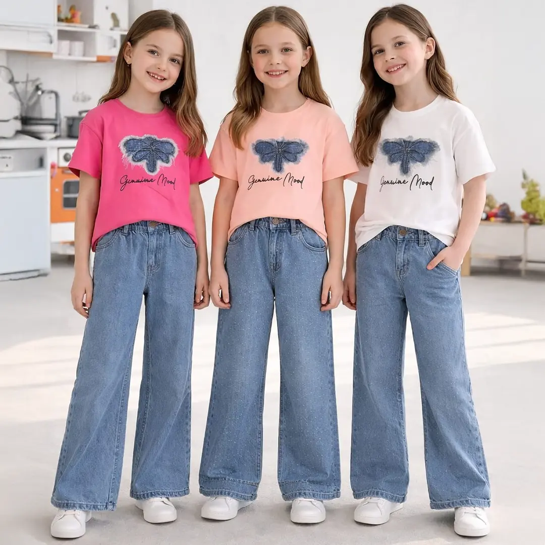 Çocukların gün boyu rahat etmesini sağlayan bu takım, geniş paça kotun trend görünümü ile baskılı tişörtün enerjik stilini bir araya getirir. Hem yaz hem de mevsim geçişlerinde kullanılabilecek bu kombin, çocuk gardıroplarının vazgeçilmez parçalarından biri olmaya adaydır.