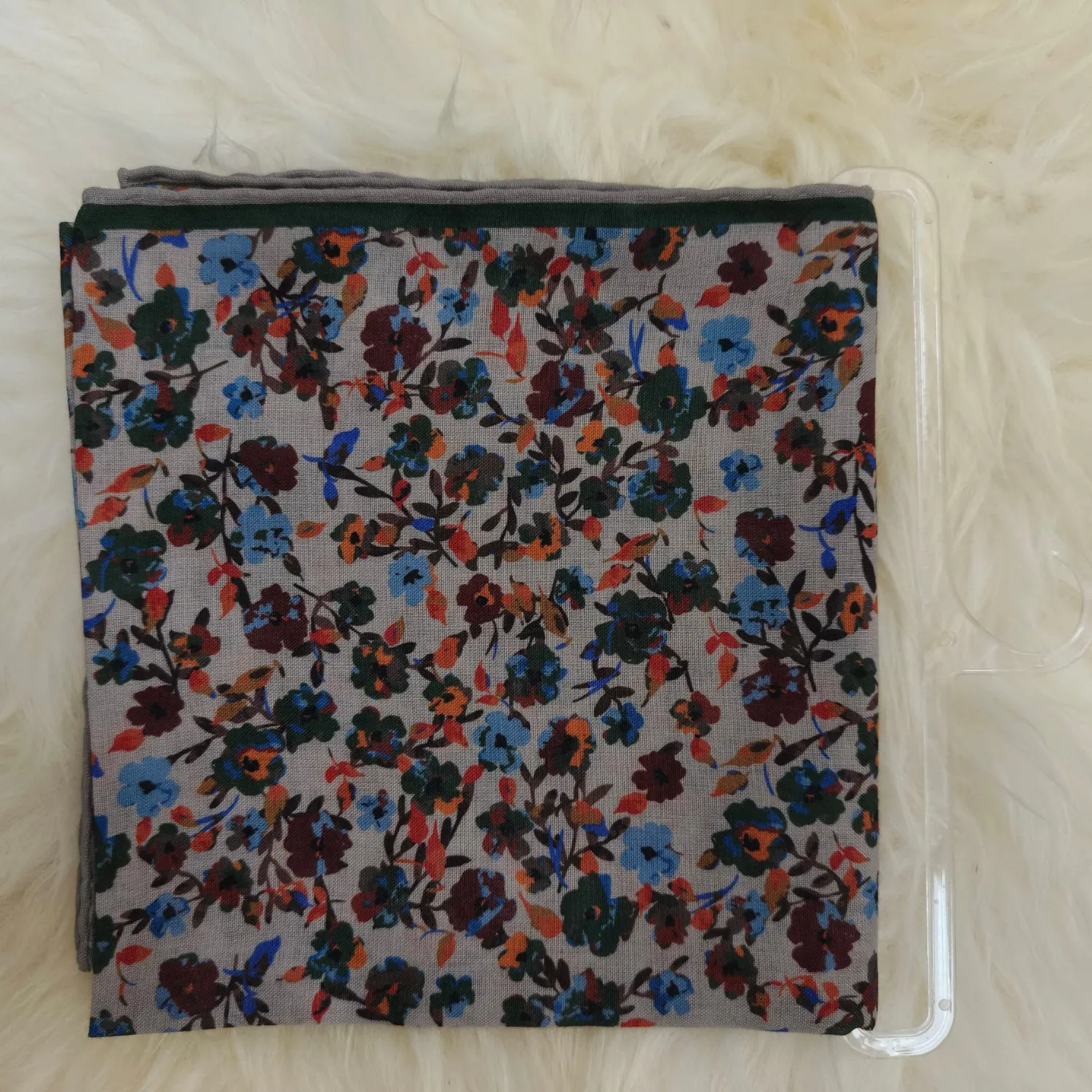 Gri Zemin Üzerine Mavi, Kırmızı ve Yeşil Tonlu Çiçek Desenli Minimal Kare Kadın Eşarp