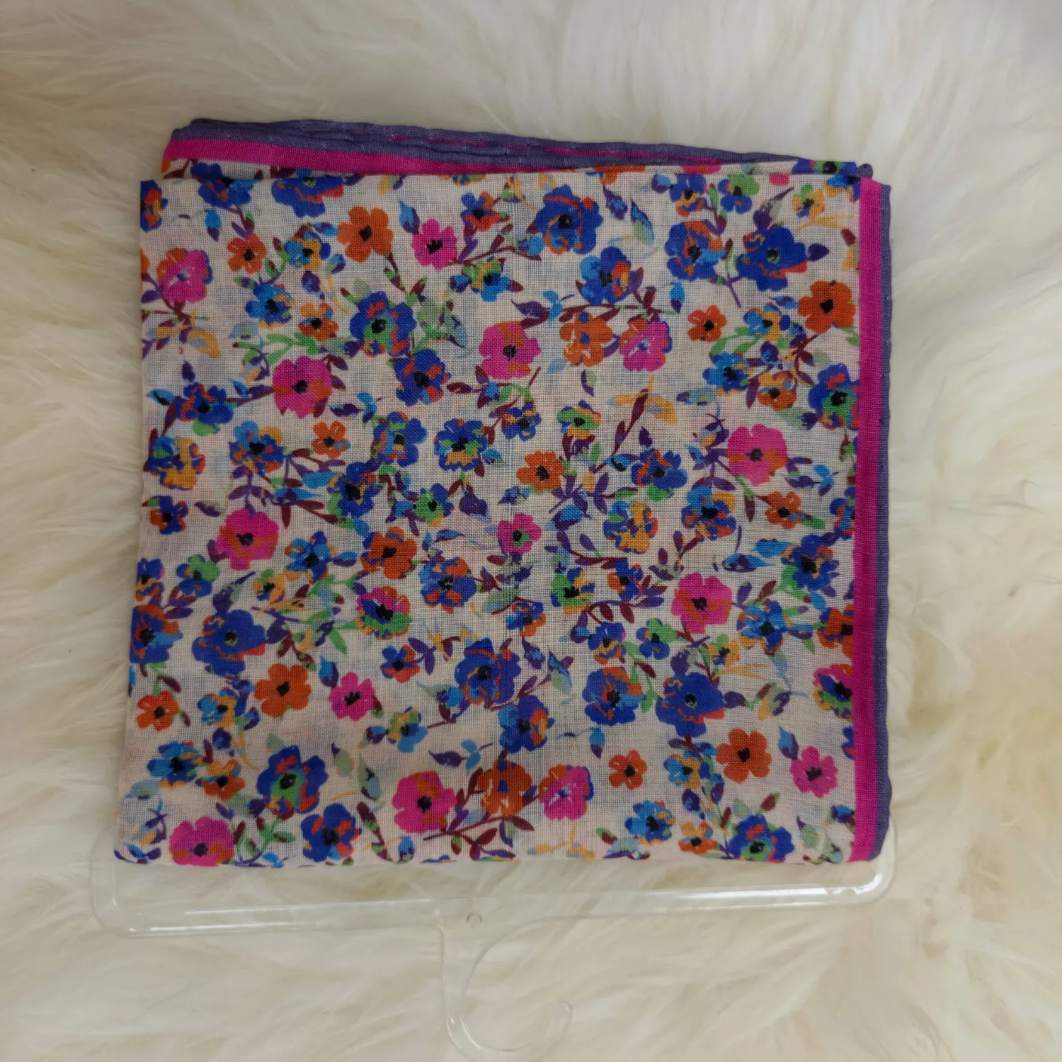 Krem Zemin Üzerine Mavi, Pembe ve Turuncu Tonlu Çiçek Desenli Minimal Kare Kadın Eşarp