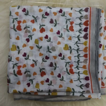 Beyaz Zemin Üzerine Turuncu, Kırmızı ve Yeşil Tonlu Kalp & Dal Desenli Minimal Kare Kadın Eşarp