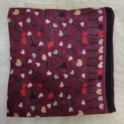 Bordo Zemin Üzerine Krem, Kırmızı ve Siyah Kalp & Dal Desenli Minimal Kare Kadın Eşarp